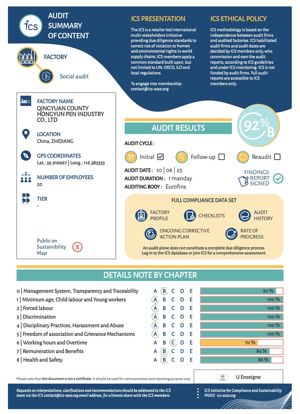 Independent auditors conduct on-site factory inspections, confidential worker interviews, and document reviews. Audit scores and corrective action plans are recorded on the ICS platform and accessible to all ICS member retailers.